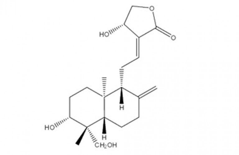 Andrographolide is a labdane diterpenoid that is the main bioactive component of the medicinal plant Andrographis paniculata. Andrographolide is an extremely bitter substance extracted from the leaves of A. paniculata.